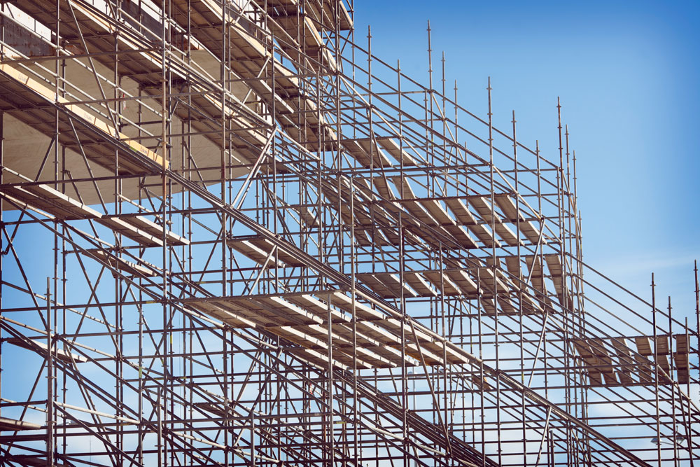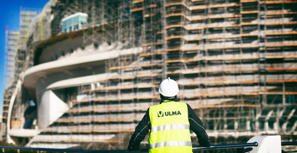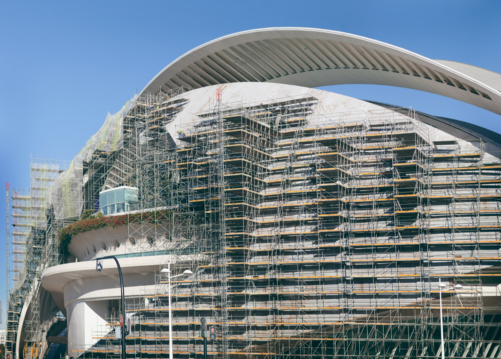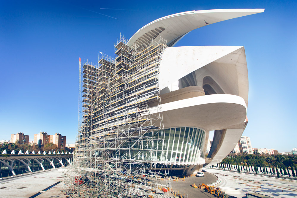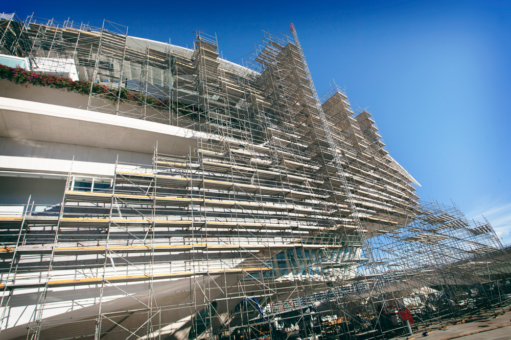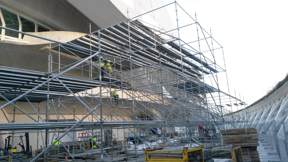 Eraikinaren kurba forma hartzeko, 48.000 m³ aldamio erabili izan dira eta 12.000 m² -ko fatxadako aldamio, elkarren segidako irtenguneekin. 700, 1.020, 1.500 eta 2.000 mm-ko zabalerako lan plataformak sortu dira. Horrela, langileen segurtasuna bermatu da une oro, eta aldamioaren eta fatxadaren artean gutxieneko distantzia mantendu da, leku guztietan. Lan lekuetara iristeko, aldamioak eskailera batzuk zituen.