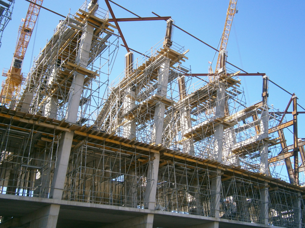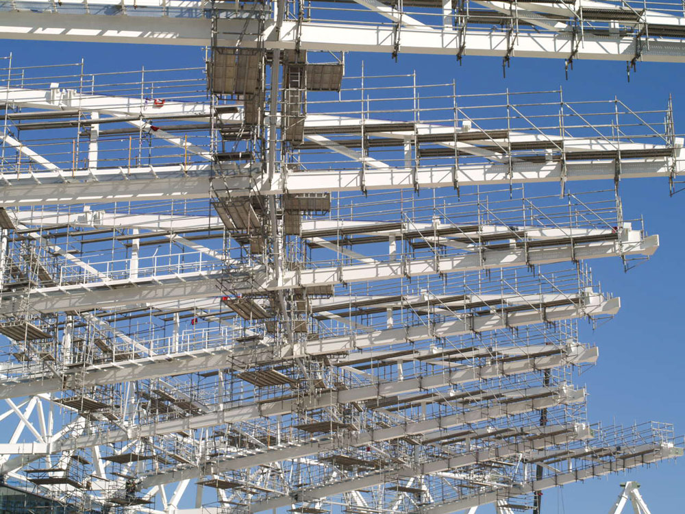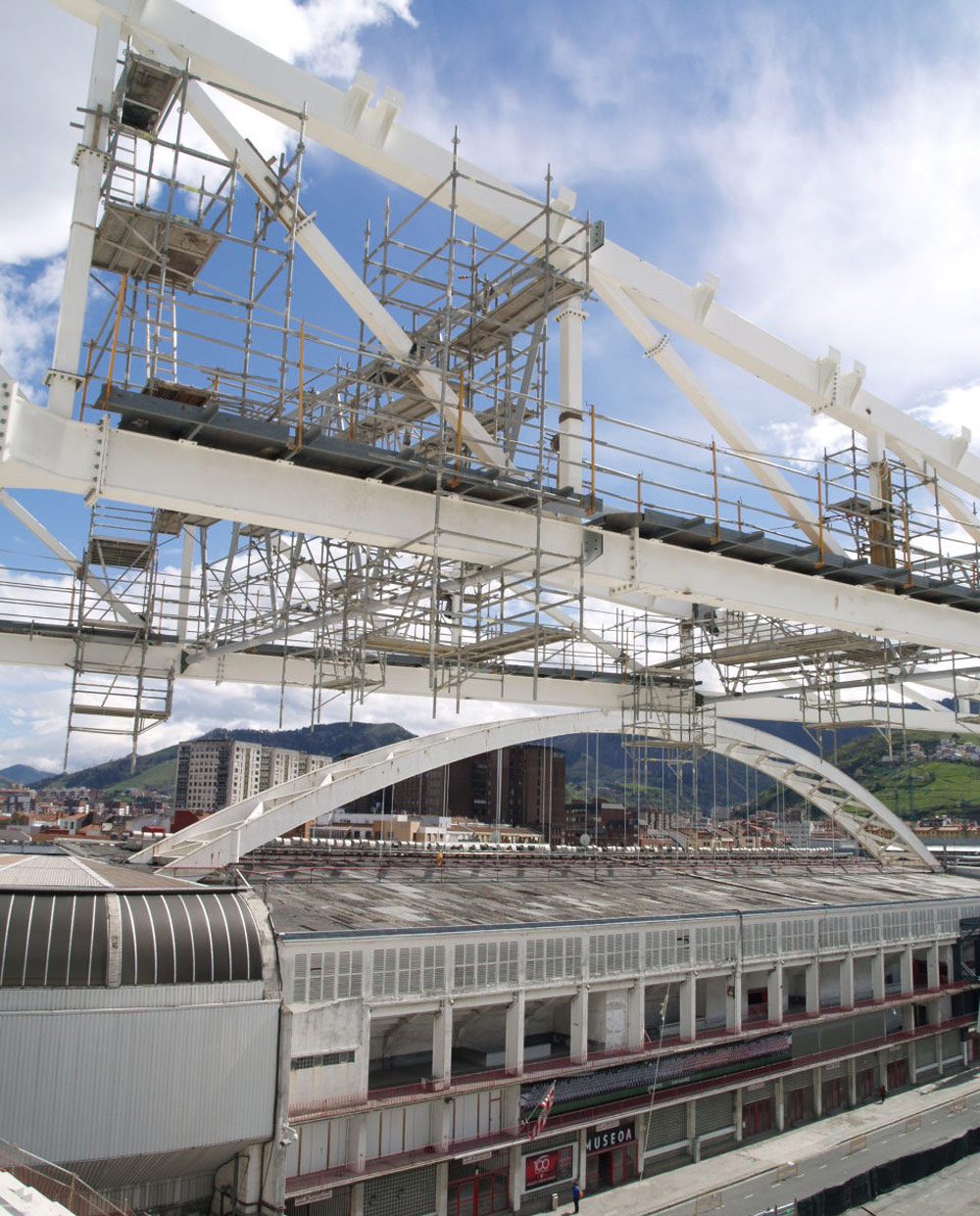 Aldamioetako lan plataformak, muntaketa lanak eta estalkiaren egitura lotzeko lanak errazteko jarri baitira, zoru mailan muntatu dira gehienbat, eta ondoren gora eraman dira dagokien lekura, estalkiaren zertxekin batera, autogarabiak erabiliz, eta azkenean lan plataforma horien akabera lanak eta loturak altueran egin dira.