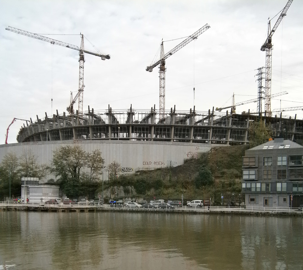 28 m altu den hormigoizko egituraren portikoak kanpoaldera ateratzen dira, eta zinbriak jartzean hegal forma eman zaie hormigoizko egituratik bertatik, zoruan bermatu gabe, obraren kanpoko perimetroan beste lan batzuei trabarik ez egiteko eta produktibitate handia lortzeko.