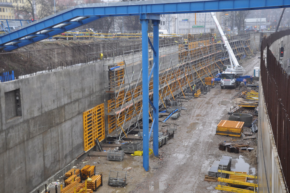Proiektuaren lehen urratsa izan da tunel bat eraikitzea, konplexuaren instalazioen azpitik ibiliko den trenerako. Tunelak 26 metroko zabalera eta 400 metroko luzera dauka. 7,5 m-ko hormak geruza bakar batean hormigoitu dira, ORMA hormen enkofratuak daukan 80 kN/m2-ko erresistentziari esker.
