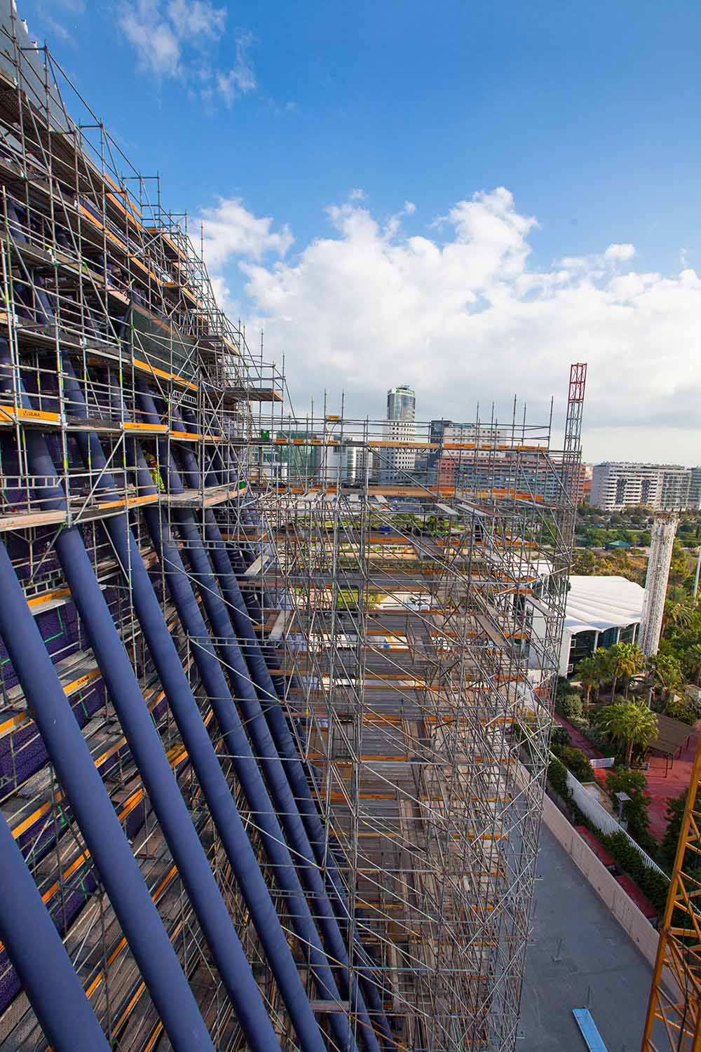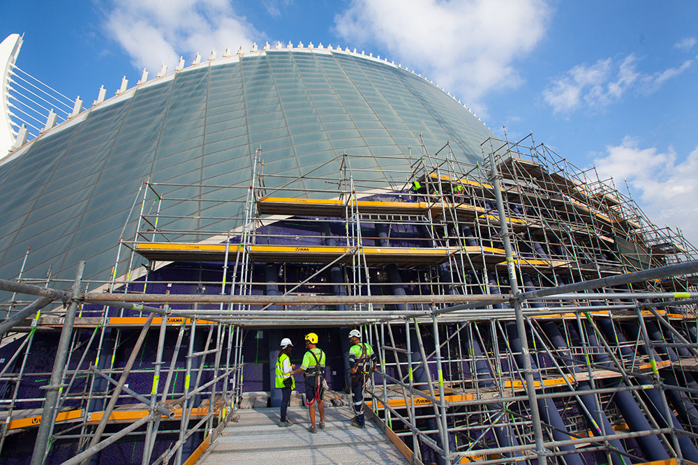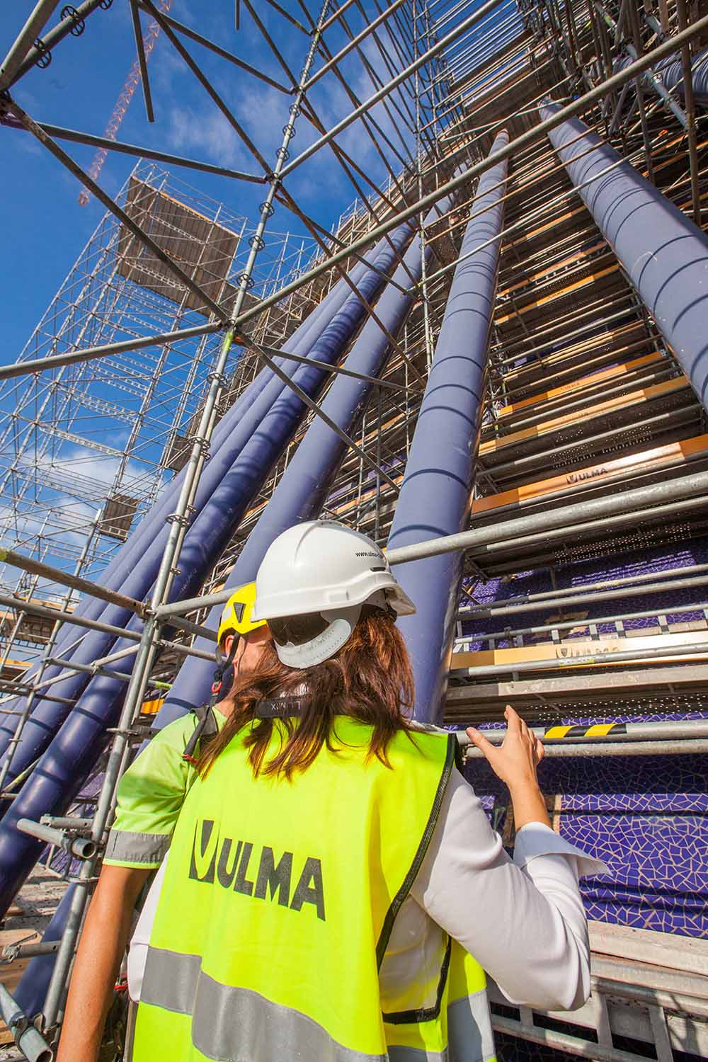 ULMA ha sido el único proveedor de soluciones de andamio. El trabajo ha consistido en la cubrición del edificio con el sistema de andamio multidireccional BRIO para la rehabilitación de más 4.247 m2. La geometría ha dificultado la aplicación, por la forma elíptica y los cambios de pendientes en las diferentes alturas.