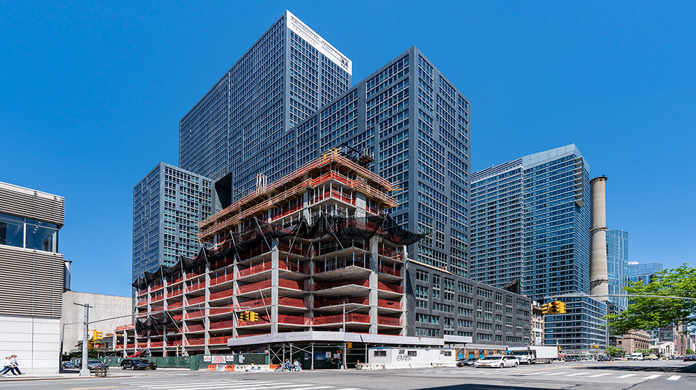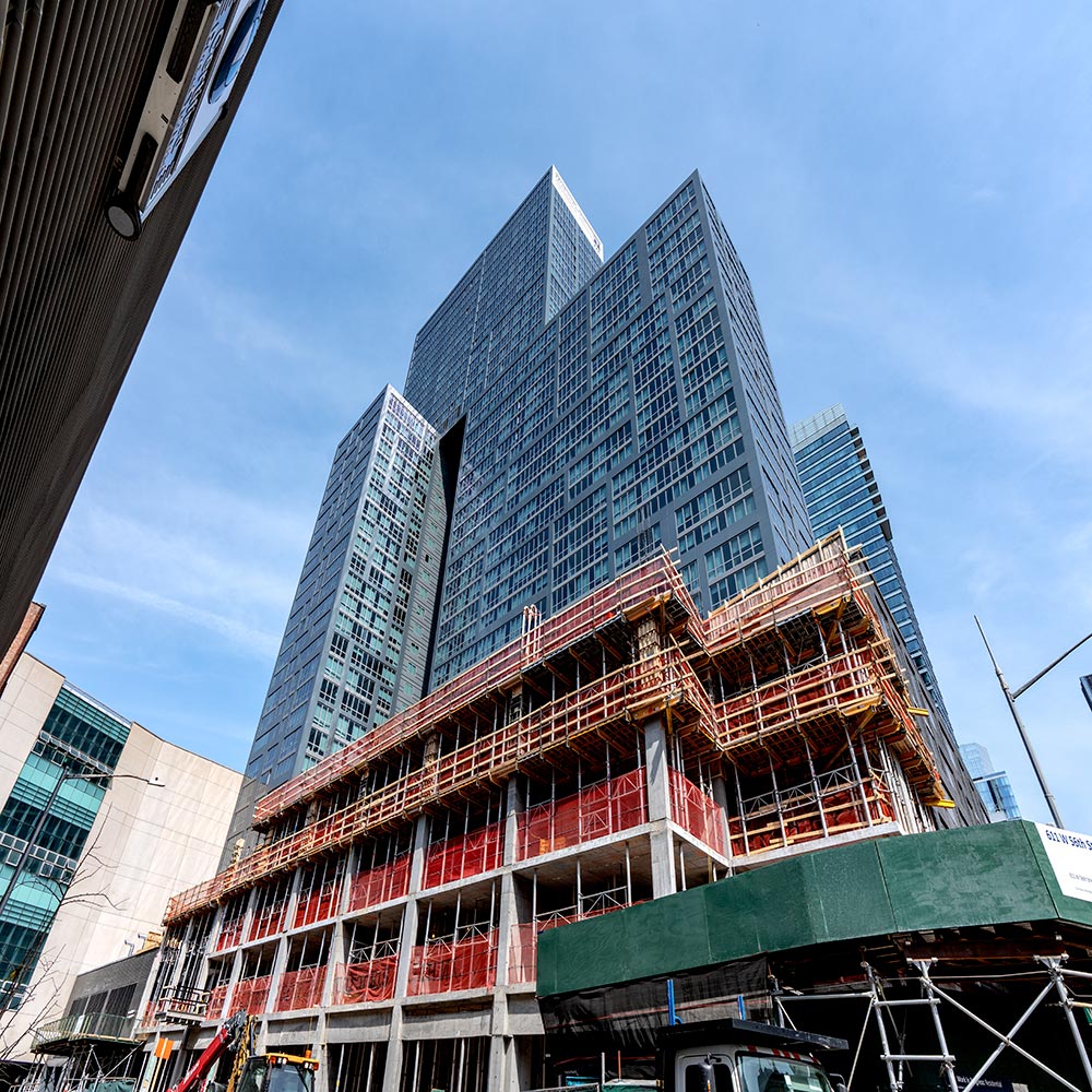 ULMA ha suministrado soluciones con tres productos diferentes para la construcción de 611 West 56th St. MEGALITE, el encofrado manuportable conocido por su peso ligero y los resistentes marcos de acero de larga duración, se ha empleado en la ejecución de paredes y columnas. El contratista, Structure Tech NY, apostó por la flexibilidad y seguridad del encofrado trepante guiado RKS para realizar los muros de los huecos interiores. El sistema RKS permite elevar toda la estructura con o sin grúa utilizando equipos de elevación hidráulica, como en este proyecto. Las plataformas del RKS fueron premontadas y entregadas en la obra, optimizando los tiempos de montaje. Finalmente, para la construcción de la losa, el cliente ha empleado encofrado de aluminio CC-4, que además de disponer de un sistema de cabezal de caída, proporciona un excelente acabado de hormigón y es perfecto para losas macizas o aligeradas. Las losas de 23 cm y 668 m² se replican hasta el octavo piso y 362 m² desde el noveno piso hasta el último.