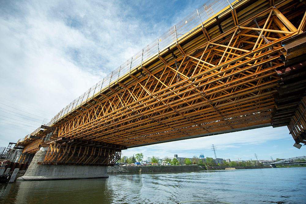 El encofrado del tablero de puente se ha realizado con ENKOFORM HMK. Un encofrado de vigas muy versátil para diversas estructuras horizontales de hormigón y ajuste perfecto a la forma de las secciones.