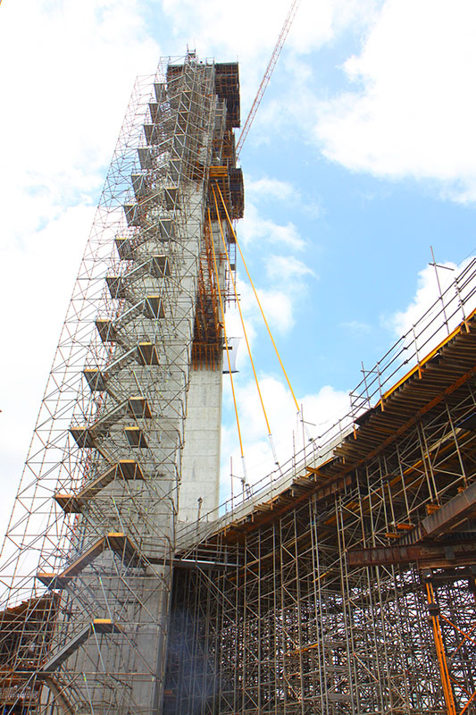 Para los dos pilonos de inclinación y sección variable a cuatro caras, se ha optado por el sistema autotrepante ATR con el encofrado de vigas de madera VMK para la parte exterior y la plataforma KSP para el interior. El sistema autotrepante se ha adaptado perfectamente a la inclinación y a la curva elíptica del fuste de hasta 23º en el último hormigonado. Todo el conjunto ha permitido grandes ritmos de ejecución, ciclos de hormigonado de 3 días en tramos de 3,6 m de altura, y sin necesidad de grúa. Además, dispone de tres niveles de plataformas de trabajo para la realización tanto de los trabajos sobre el encofrado, ferrallado u hormigonado, como en las labores de elevación de la estructura, manteniendo así en todo momento los estrictos niveles de seguridad precisos a grandes alturas. A pesar de la complejidad de la geometría, el sistema MK en sus diferentes aplicaciones ha solucionado cada uno de los requerimientos estructurales.